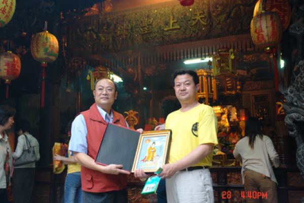 2006年4月长岛县领导于旭华向北港朝天宫董事长蔡永常赠送长岛三面妈祖塑像